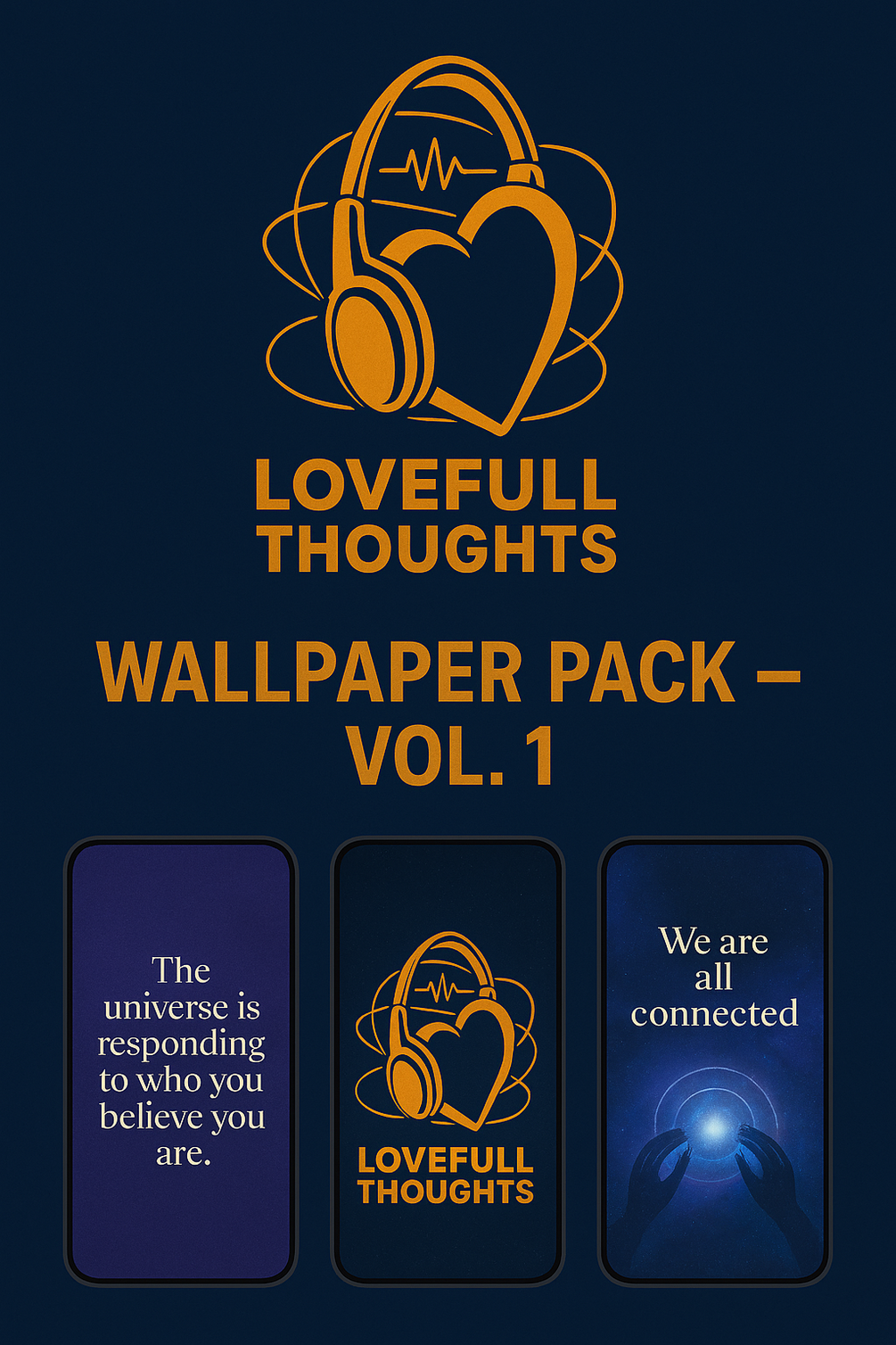 The Lovefull Thoughts Wallpaper Pack is designed to elevate your energy every time you unlock your phone. Featuring glowing silhouettes, cosmic unity art, and branded heart-headphone symbols, this set brings peace, purpose, and empowerment to your daily life.